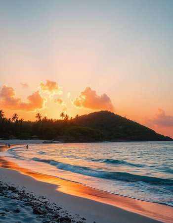 Golden sand stretches along the shore, where gentle waves lap at the beach. Palm trees sway in the warm breeze under a clear blue sky, creating a serene tropical atmosphere.