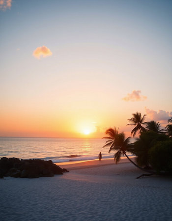 Beautiful sunset on the beach with palm trees in the background.