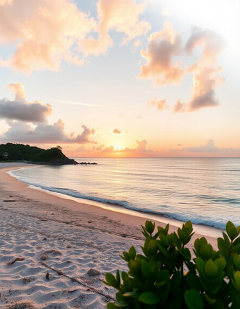 Serene beach sunrise with gentle ocean waves, calming seascape. Nature tranquility and relaxation concept
