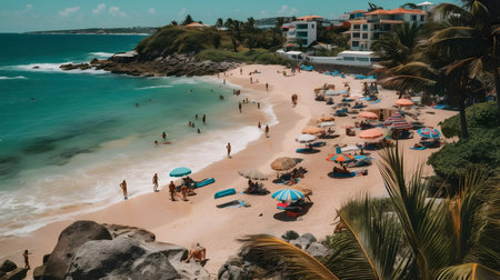 A panoramic view of a tropical beach with people relaxing under palm trees, enjoying the sun and the beautiful turquoise waters.