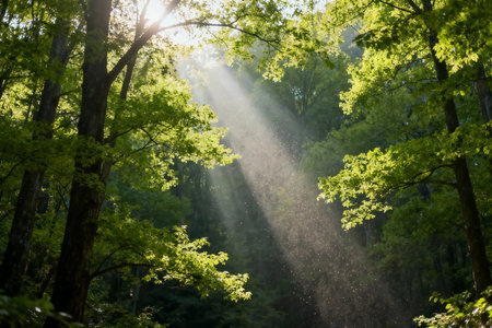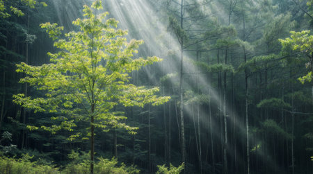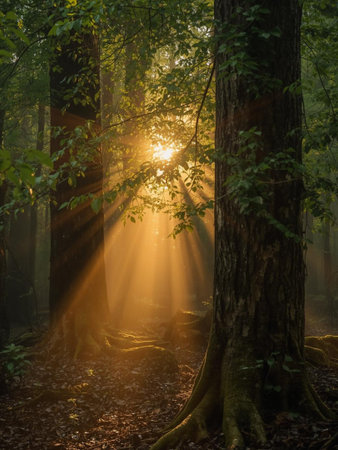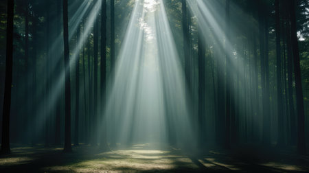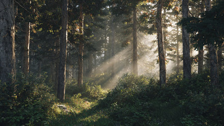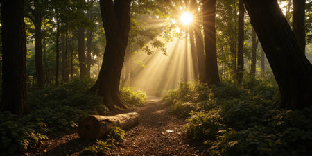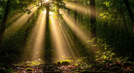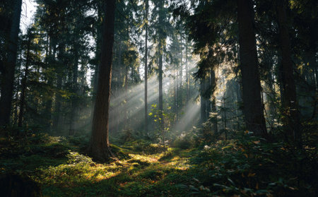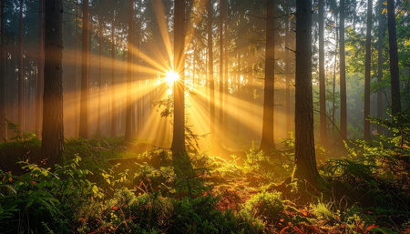 Sunbeams filter through tall trees in serene forest, creating beautiful silhouettes and illuminating lush undergrowth. warm light enhances tranquil atmosphere, inviting peace and reflection