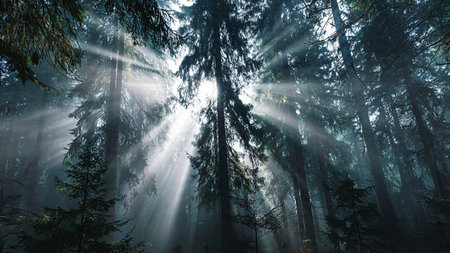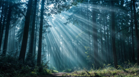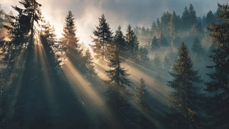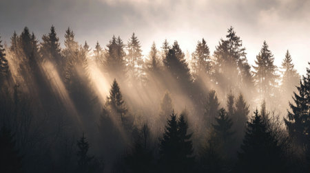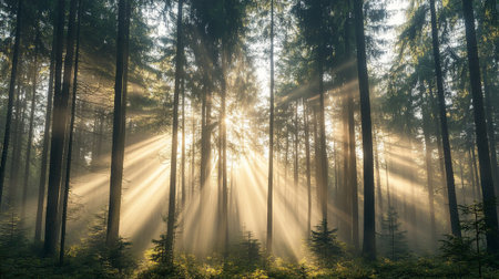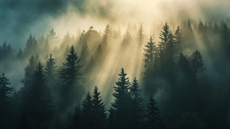 A serene forest scene featuring beams of sunlight breaking through a thick mist, creating a magical atmosphere. The silhouette of pine trees adds depth and tranquility.