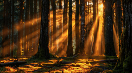Golden sunbeams pierce through the dense canopy of tall trees in a forest. Clear details and vibrant colors en...