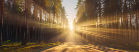 Sunbeams shine through the trees onto an empty road in a pine forest