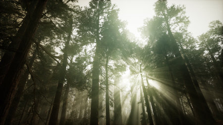 Redwood Forest in Sunlight, Green Pine Trees in Sunlight Rays Falling, Copy Space, Generative AI Illustration