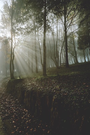 Foggy morning in the coniferous forest. Sun rays through the trees
