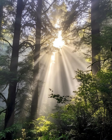 Discover a serene and ethereal forest scene where sunlight pierces through mist, illuminating towering trees and creating a peaceful atmosphere in nature.