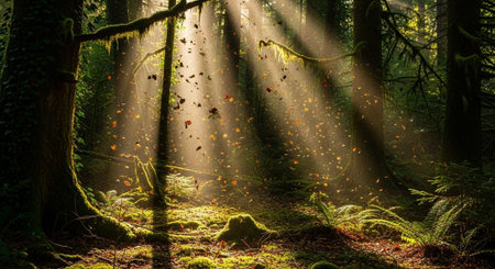 Dense forest with sunlight filtering through tall trees, creating magical atmosphere. warm rays illuminate forest floor, highlighting vibrant greenery and moss