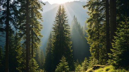 A serene forest scene with sunlight filtering through the leaves of evergreen trees. The sunbeams create a sense of depth and tranquility, highlighting the green foliage and branches. The atmosphere is peaceful and calming.