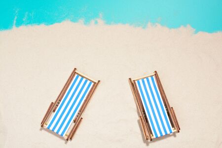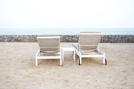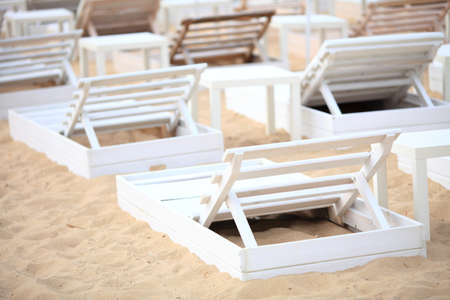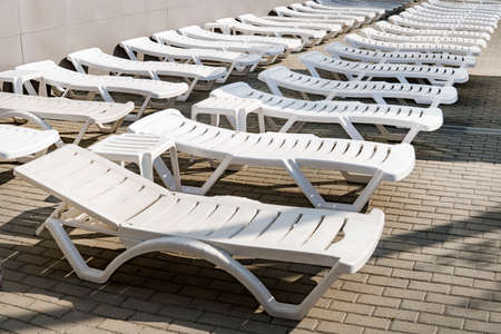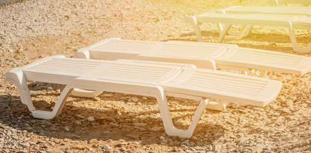 Row of empty white pool plastic chairs deckchairs on sand beach. Vacation concept