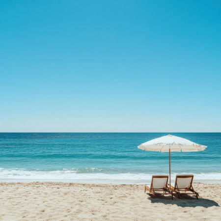 A lounge chair sits under an umbrella on sandy shore, with gentle ocean waves lapping at the beach beneath a clear blue sky.