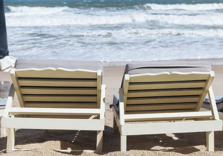 Empty Sun loungers in front of the sea. Sun chairs on sandy beach. Big waves stormy weather. An empty chaise longue and folded umbrella stand at the edge of the sea. summer vacation