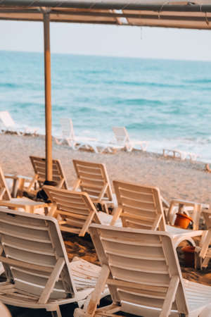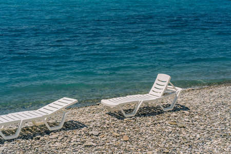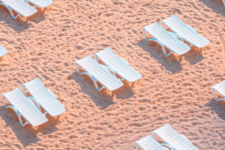 Aerial view of empty sunbeds on the beach. Tourism background photo. Plastic white sunbeds with no people. Tourism, vacation, holiday, recreation advertising.