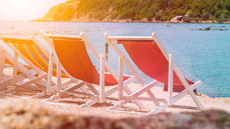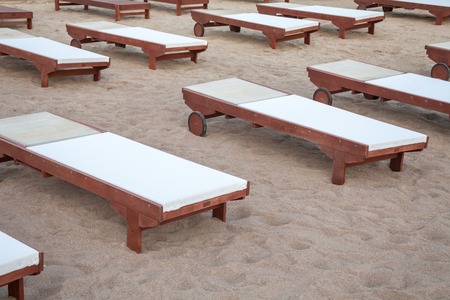 Row of empty wooden beach chairs on a summer day, outdoor photo. Brown sun loungers on shore of lake
