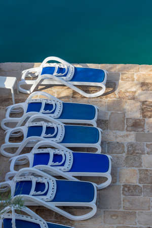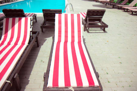 Striped red and white loungers near the swimming pool on a summer day. Sun chairs at the pool