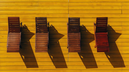 Sunbathing lounge chairs arranged in flat lay style on vibrant yellow background, casting distinct shadows that enhance visual appeal. warm colors evoke relaxing atmosphere