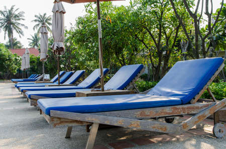 Vacation and Relaxation Concept : Daybed beside swimming pool in the resort with sea and blue sky background.