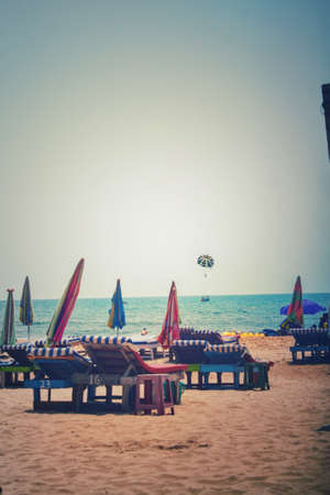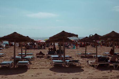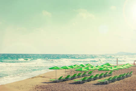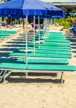 View of the sea beach - umbrellas and deckchairs on the south coast. Toned image.