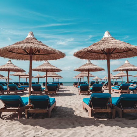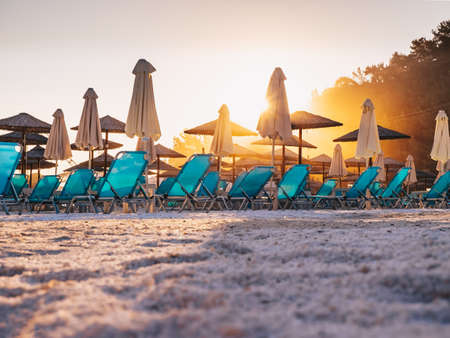 Sea beach with umbrellas and sunbeds. Summer holiday and relaxation concept