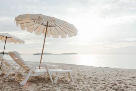 Blurred background of the resort beach with sun loungers and umbrellas in Thailand. Travel business .