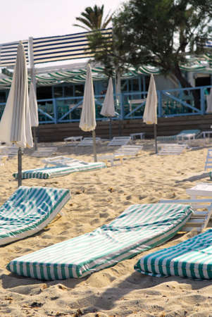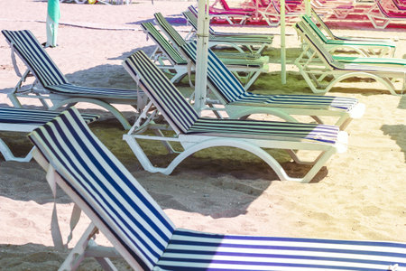 striped plastic sun loungers on the beach on the sand under sun umbrellas.
