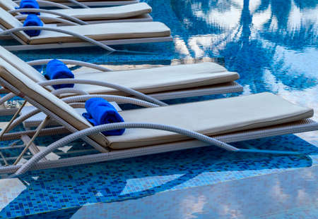 Luxury beach resort hotel swimming pool with leisure beach chairs and palm trees in sunny seaside
