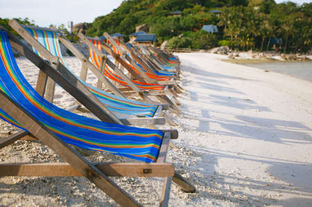 Appealing Beach Chairs on Sand. Palm Trees and Ocean in Background. Haad Salat. Ko Phangan, Thailand.