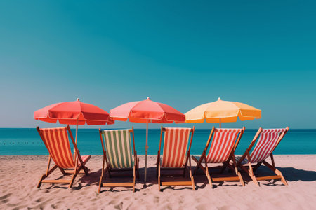 Colorful beach chairs line a serene shoreline under a picturesque sky, inviting relaxation and leisure during a perfect summer outing by the ocean.