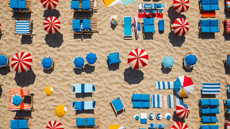 This image captures an aerial view of a vibrant beach setting with various colorful umbrellas and lounge chairs neatly arranged on the sandy shore, depicting a lively summer vacation atmosphere. AI generated image