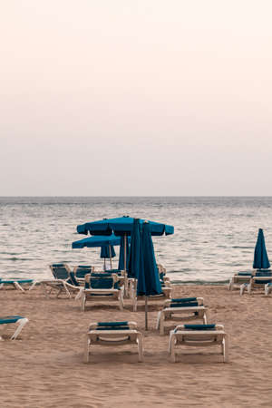 benidorm beach empty, no people. with hammocks and parasols, cloudy day. pandemic, coronavirus