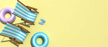 Top view of beach chairs and umbrella, Summer concept, Minimal scene. 3D rendering.