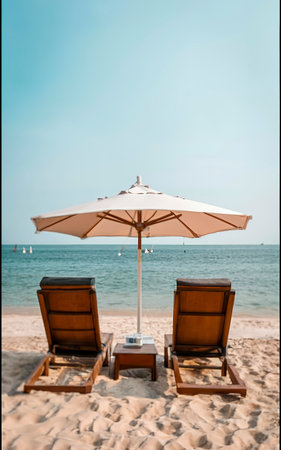 Back view of two wooden sunbeds together on the beautiful beach in the morning, the background of a wide-open view of sea and horizon, blank space for copy.