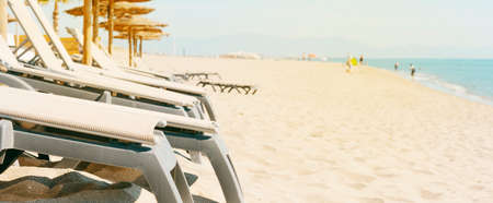 closeup of some beige sunloungers and some sun umbrellas on a quiet beach, in a panoramic format to use as web banner or header