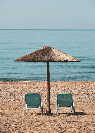 Reed beach umbrella with sunbeds on sandy beach at sea.