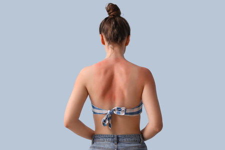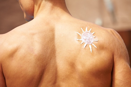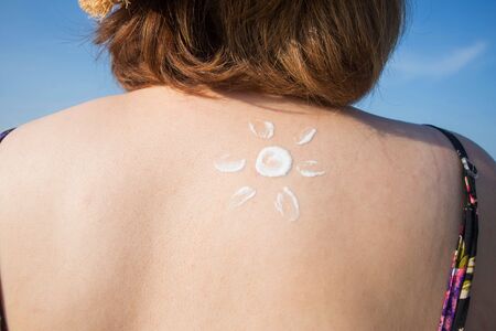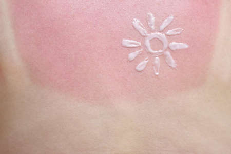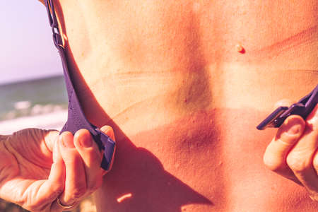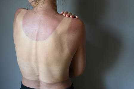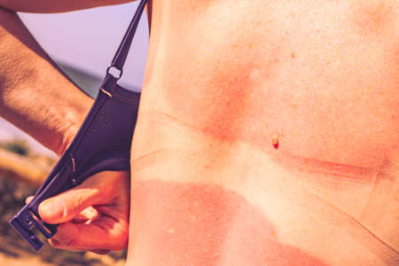 Burned skin on the back. Incorrect tanning of the body. Sun prevention concept. Using sunscreen.