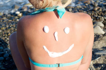 Back view of young woman tanning at the beach with sunscreen cream in sun shape on her shoulder. UV sunburn protection and sunblock skincare concept