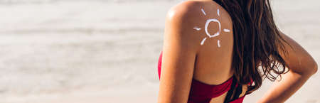 Woman applying sun protection lotion. Young woman using sunscreen on the sea background.