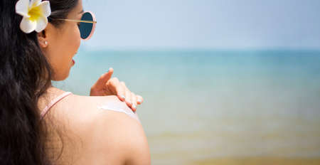 young asian woman with suntan lotion at the beach at sunny day. subject is blurred