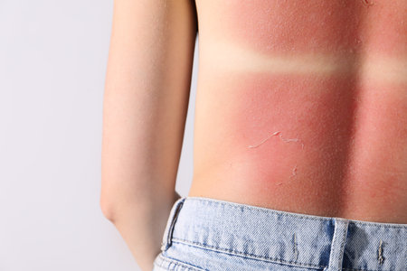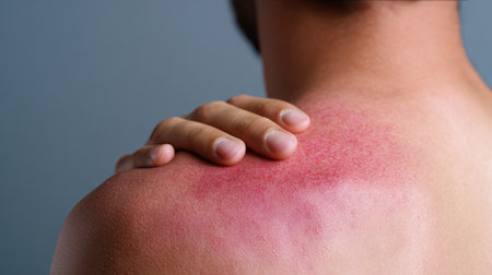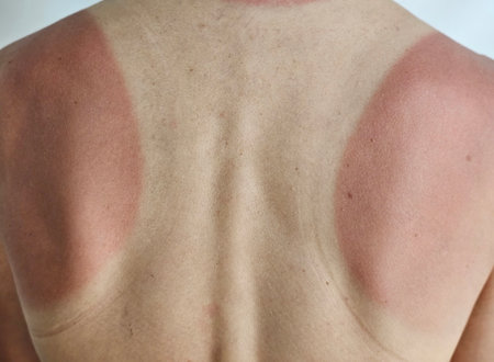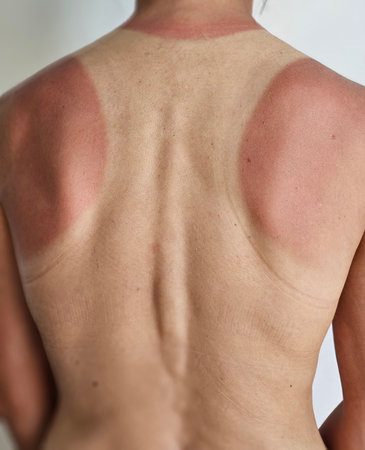Sunburned back with red patches indicating overexposure during outdoor activity