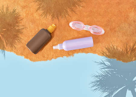 Sunscreen and glasses on the beach. Selective focus. Travel.