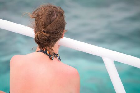 Caucasian woman back and shoulders skin hurt from sun burn. Severely burned skin, red tanned body