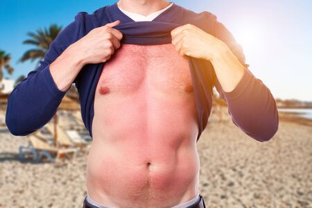 A man with reddened, itchy skin after sunburn. Skin care and protection from the sun's ultraviolet rays.
