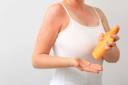 Applying therapeutic ointment to the skin of a person with a sunburn, close-up.