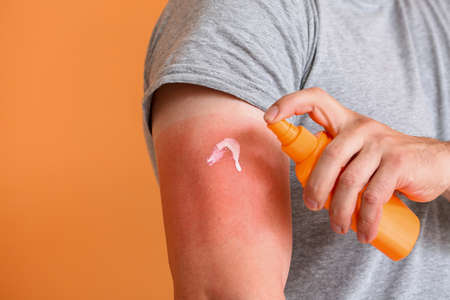 Applying sunscreen or therapeutic spray to the skin of a man with a sunburn