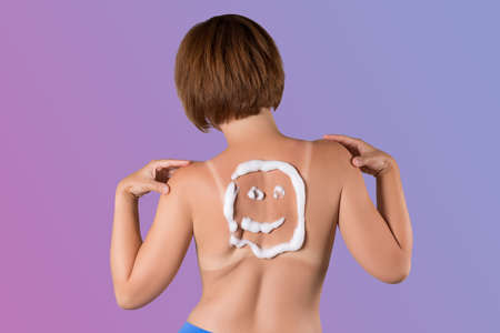Sunburned woman, sunburn marks on the body, smiley sunscreen on the back, purple background with a gradient