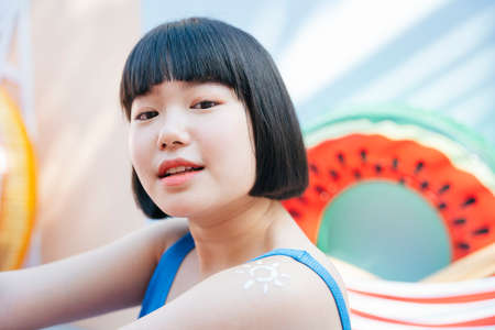 Beautiful bob haircut asian woman in blue tank top shirt putting cream lotion on her arm before going to the beach.