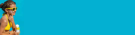 The hands of a young girl, in a blue swimsuit and shorts are going to smear on themselves a cream for sunbathing and protection from the sun against the background of the beach.