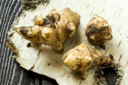 Fresh organic jerusalem artichoke (Helianthus tuberosus) with soil particles on birch bark. Selective focus