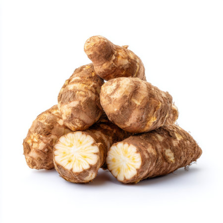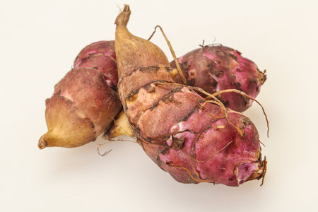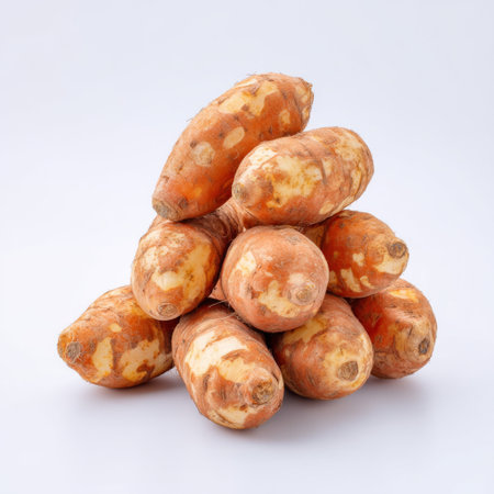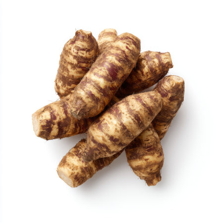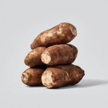 Fresh taro roots arranged on a clean white background. Perfect for culinary uses, nutrition-focused recipes, and promoting healthy eating habits. Ideal for chefs and food enthusiasts.