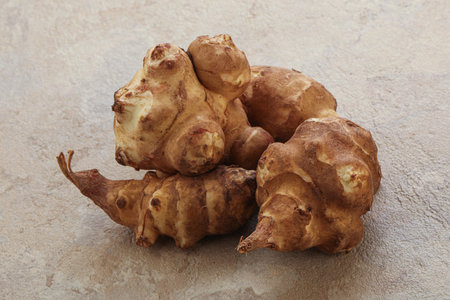 Organic Jerusalem artichoke on textured background. Autumn harvest of root vegetables. Concept healthy food.